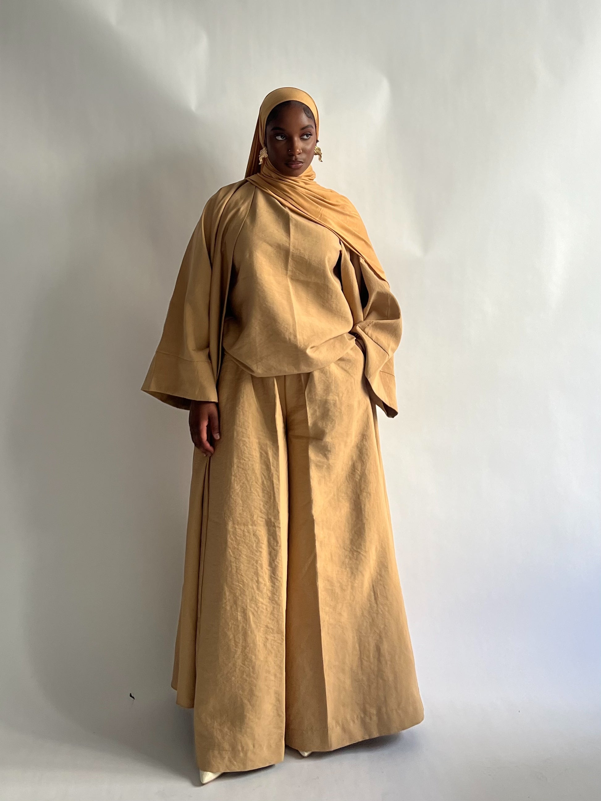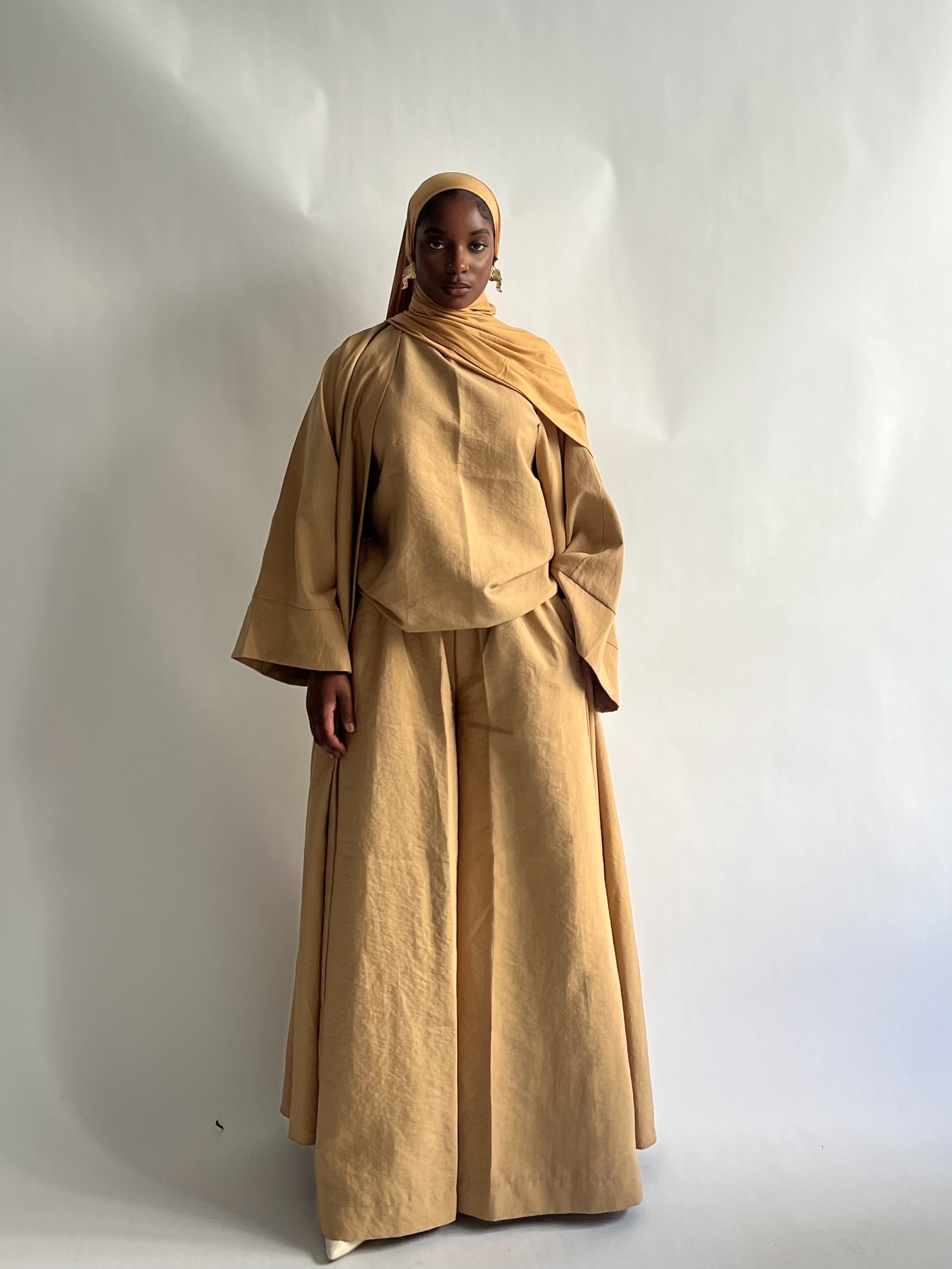 An elevated three-piece set designed for effortless sophistication. The Solara Set features structured wide-leg pants, a relaxed top, and a flowing abaya layered on top, creating a complete look that feels both refined and powerful.